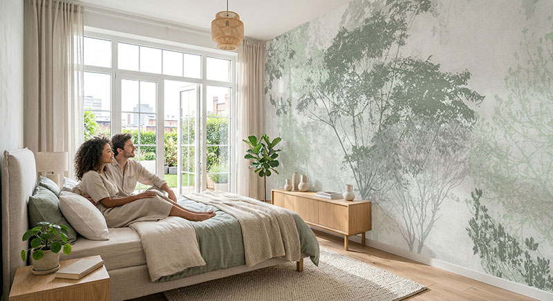 Trzymaj się naturalnej palety – zielenie, beże, szarości, delikatne brązy. Takie kolory nie zestarzeją się za dwa lata, a właśnie tego chcesz, bo fototapety nie zmienia się co sezon.