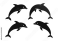 Fototapeta Silhouette illustrations of four playful dolphins jumping in the ocean against a white background.