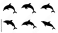 Fototapeta Six playful dolphin silhouettes leaping and swimming in fluid motion against a white background.