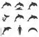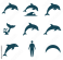 Fototapeta Dolphin silhouettes in various swimming poses and a human figure on white background