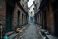 Fototapeta Dark, gritty urban alleyway with worn stone walls and scattered trash, grunge, abandoned, night