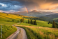 Fototapeta Amazing scene in summer mountains. Lush green grassy meadows in fantastic evening sunlight. Rural road and beautiful rainbow in dramatic sky.