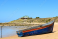 Fototapeta Immigrant dinghy boat stranded at the beach of Zahora, South Spain, near Africa.
