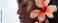 Fototapeta Close-up of a beautiful black woman with a hibiscus flower in her hair on a white background, the concept of skin care and beauty.