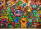 Fototapeta Vibrant graffiti artwork adorns a worn, scratched brick wall in a urban setting, featuring colorful doodles, shapes, and lines that add a splash of personality.