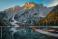 Fototapeta Anchored wooden boats on the lake Braies at sunrise, Dolomites