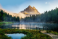 Nastrojowa fototapeta przedstawia spokojne górskie jezioro otulone poranną mgłą, z majestatycznym szczytem skąpanym w złotym świetle wschodu. Na pierwszym planie znajduje się niewielki drewniany pomost z ławeczką, zapraszający do chwili wytchnienia. Soczysta zieleń lasu i lustrzane odbicia w wodzie wprowadzają do wnętrza harmonię i poczucie bliskości natury. Idealna do salonu, sypialni, biura czy strefy relaksu, optycznie powiększa przestrzeń i dodaje jej głębi. Wysokiej jakości druk w naturalnych barwach podkreśla detale krajobrazu i efekt przestrzenności.