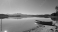 Fototapeta A serene lake scene with a canoe on the shore and mountains in the background.