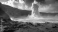 Fototapeta Dramatic view of a volcanic eruption with dark rocks, ocean waves and a cloudy sky