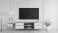 Fototapeta Modern Living Room: Clean lines and minimalist design characterize this modern living room, featuring a sleek television mounted above a wooden cabinet, accented by elegant decor and natural light.