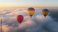 Fototapeta Sunrise hot air balloons soaring above cloudscape, aerial view, travel