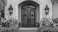 Fototapeta Elegant Italian facade featuring double wood doors, cascading flowers, and black wrought-iron lanterns
