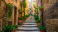 Fototapeta Narrow Stone Alleyway in Ortigia With Hanging Plants and Sunlight Filtering In
