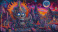 Fototapeta Surreal landscape painting; fiery skull creature dominates alien world; cosmic background; fantasy art for album cover or game design