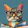 Fototapeta Colorful Illustrated Cat with Glasses Reading a Book on Teal Background