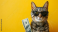 Fototapeta Cool rich successful hipster cat with sunglasses and cash money Yellow background , very good , Wide Shots , bright tone, Ultra clear image, Add Copyspace