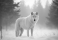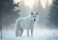 Fototapeta A white arctic wolf standing in a snowy forest, with trees and branches in the background