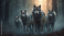 Fototapeta Majestic wolf pack in foggy forest. Mystical wildlife concept with timber wolves. Wolves stand together, strong, free in natural habitat, alpha male looking directly to viewer. Wilderness, nature,