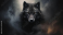 Fototapeta AI generated illustration of a fierce wolf with glowing orange eyes against a dark black background