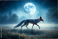 Fototapeta A white fox is walking through a field of tall grass. The moon is in the background, casting a silvery light over the scene. Scene is peaceful and serene, as the fox moves through the quiet