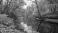 Fototapeta Reflective creek waters with fallen leaves and tree branches in autumn hue, woodland scenery, seasonal change