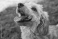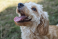 Fototapeta Happy Goldendoodle dog looking up at the sky with its tongue out in studio lighting. AI generated illustration