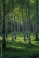 Fototapeta Sunlight filters through the canopy of a vibrant green forest filled with tall birch trees. The ground is lush with grass and ferns, creating a serene atmosphere
