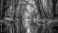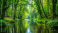 Fototapeta A tranquil stream winding through a dense, vibrant green forest with towering trees and lush vegetation surrounding its banks, serene, woodland