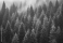 Fototapeta a dense evergreen forest fades into a soft mist, creating a serene and atmospheric landscape.