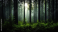 Fototapeta The Sunlight Peeking Through the Tall Trees in a Dark Forest