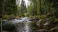 Fototapeta Serene woodland river flows swiftly amidst moss-covered rocks and verdant trees in natural beauty.