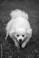 Fototapeta Fluffy white American eskimo dog running and playing in the grass.