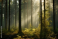 Fototapeta Natural forest of spruce trees, sunbeams through fog create mystic atmosphere. Generative AI