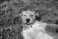 Fototapeta a smiling soft coated wheaten terrier puppy dog playfully bites and shows sharp teeth. Outside on grass with fluffy fur and tongue. Laughing and happy doggy