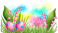 Fototapeta Vibrant easter eggs and flowers in lush green grass with colorful background