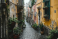Fototapeta Narrow, cobblestone alleyway lined with weathered, yellow buildings and potted plants