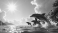Fototapeta Three dolphins leap from ocean water. Sunny day. Blue sea. Coastal rocks. Wildlife scene. Marine mammals jump. Aquatic animals swim. Nature photo. Ocean jump.