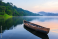 Naklejka na meble Serene Sunrise Over a Calm Lake With a Lone Wooden Boat
