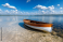 Naklejka na meble Wooden Rowboat on Sandy Shore of Calm Lake Under Sunny Blue Sky