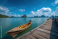 Fototapeta Vibrant photo of Traditional wooden longtail boat moored at a wooden pier in the turquoise sea with limestone islands in the background.