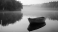 Fototapeta A serene lake at dawn with a lone rowboat gently floating amid misty woodlands