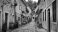 Fototapeta A narrow cobblestone street in a historic European town, flanked by charming old buildings and quaint shops.