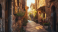 Naklejka na meble Quaint cobblestone alley in picturesque village town. Warm sunlight casts soft glow on rustic stone buildings. Ideal for travel posters and background images. AI.