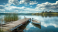 Fototapeta Picturesque lake landscape with a row boat and old wooden bridge, serene water and stunning sky, peaceful environment.