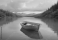 Naklejka na meble A small fishing boat on a calm body of water at sunset, with mountains in the background
