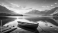 Fototapeta A rustic rowboat drifts on a calm lake, oars still, as the sun sets behind towering mountains