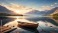 Naklejka na meble A rustic rowboat drifts on a calm lake, oars still, as the sun sets behind towering mountains