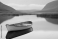 Naklejka na meble Serene lake scene with solitary boat in tranquil landscape