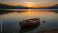 Fototapeta A wooden boat floats on calm water at sunset, reflecting vibrant orange and gold hues, surrounded by serene mountains and trees.