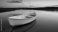 Fototapeta Serene sunset over calm lake with a single white rowboat.